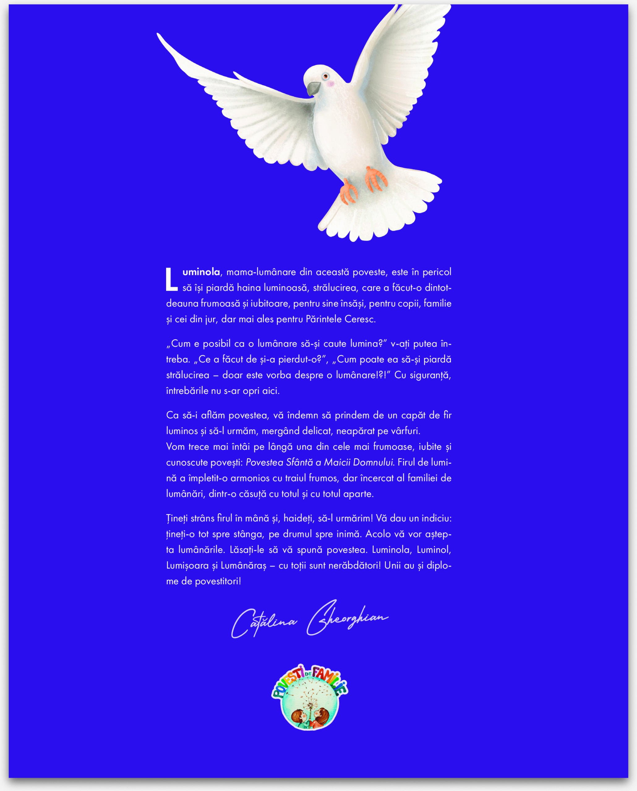 Ca să-i aflăm povestea, vă îndemn să prindem de un capăt de fir luminos și să-l urmăm mergând delicat, neapărat pe vârfuri. Vom trece mai întâi pe lângă una din cele mai frumoase, iubite și cunoscute povești: Povestea Sfântă a Maicii Domnului. Tineţi strâns firul în mână și, haideți, să-l urmărim! Vă dau un indiciu: tineți-o tot spre stânga, pe drumul spre inimă. Acolo vă vor aștepta lumânările. Lăsați-le să vă spună povestea. Luminola, Luminol, Lumișoara și Lumânăraş – cu toții sunt nerăbdători! Unii au și diplome de povestitori!”