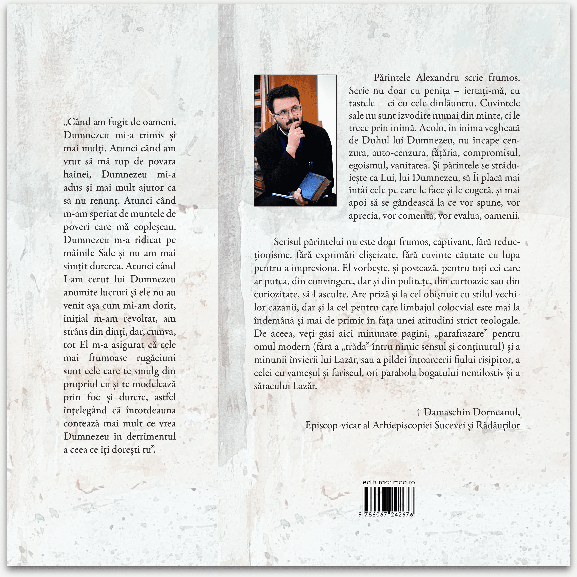 Părintele Alexandru scrie frumos. Scrie nu doar cu penița – iertați-mă, cu tastele – ci cu cele dinlăuntru. Cuvintele sale nu sunt izvodite numai din minte, ci le trece prin inimă. Acolo, în inima vegheată de Duhul lui Dumnezeu, nu încape cenzura, auto-cenzura, fățăria, compromisul, egoismul, vanitatea. Și părintele se străduiește ca Lui, lui Dumnezeu, să Îi placă mai întâi cele pe care le face și le cugetă, și mai apoi să se gândească la ce vor spune, vor aprecia, vor comenta, vor evalua, oamenii.
