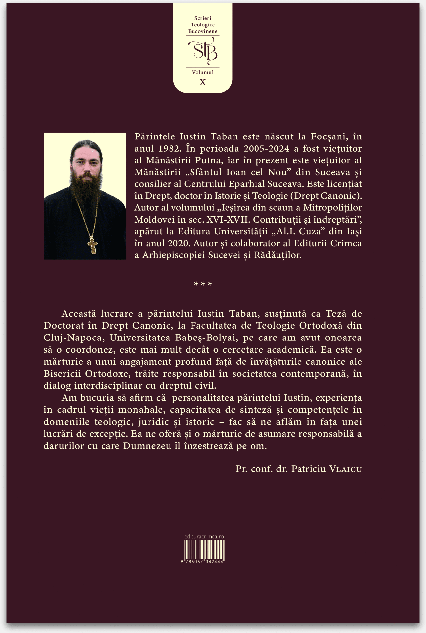 Cartea părintelui protosinghel Iustin Taban reprezintă prima teza de doctorat în Drept Canonic susținută la Universitatea Babeș-Bolyai Cluj Napoca. Lucrarea a fost prezentată într-un cadru academic de excepție, avându-i ca referenți pe Pr. Conf. Dr. Patriciu Vlaicu, Pr. Prof. Dr. George Grigoriță, Pr. Conf. Dr. Emilian Iustinian Roman și Conf. univ. dr. Liviu Marius Harosa. Cartea reprezintă o analiză profundă a instituției monahismului în Biserica Ortodoxă Română și a statutului monahilor în Biserică și în societate, prin prisma interacțiunii dintre Dreptul Canonic și Dreptul Civil.